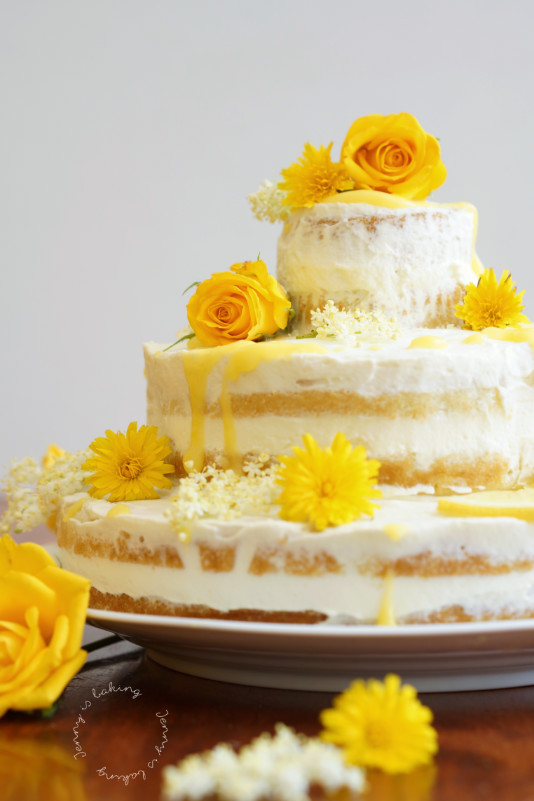 For the cake line a 24cm (9inch), 15cm (6inch) and a muffin tin with parchment paper and grease the sides. Alternatively line two 24cm (9inch) cake tins if you want to make a one-tire cake. Preheat oven to 180 degrees Celsius. Sift the flour with baking powder, baking soda, salt and lemon zest in a bowl and set aside. Mix the buttermilk with the lemon juice and also set aside. Now beat the soft butter with the sugar for a few minutes, add one egg at a time and incorporate fully, add the vanilla extract last until combined. Alternating the flour mix with the buttermilk, add the rest in three turns. The cake mix will be very thick. Pour into prepared tins and bake, take out muffin at about 12 minutes, the smaller cake at 20min and the biggest cake at 25-28min. All should look golden on the top. Let cool completely before taking out of the tins and wraping in plastic wrap. Chill in the fridge. You can prepare the cakes the day before, chill in the fridge until further use. Meanwhile for the lemon curd place all ingredients except for the butter in a medium-sized pot. Make sure you check beforehand that the pot fits, without touching the bottom, into a large pot as you will have to thicken the curd in a double-boiler. Pour water about 4-5cm high into the large pot and bring to boil. Then reduce temperature so that water simmers. Make sure the water is not too hot, but really only simmers. Now place the pot with the egg mix on top and check whether you find it too sour. If you do, feel free to increase the amount of sugar. Start whisking. Whisk all the time. It takes about 10 minutes for the curd to start thickening, so don't increase the temperature too early as otherwise the egg yolks will curdle. If it doesn't thicken after ten minutes, increase the temperature gently. Once you have the consistency of a thick sauce, take the pot out (still stirring) and slowly add the butter. I usually cut the butter into 4-6 pieces and add one piece at the time. Transfer to a jar and chill. For the frosting place heavy cream and elderflower syrup in a bowl and beat until soft peaks form. Add the mascarpone cream and beat until stiff peaks form. Chill until further use. To assemble the cake first cut all three cakes in half using a serrated knife. Brush the bottom layer with the elderflower syrup. Then pipe a ring around the edges with the mascarpone cream (see pictures) and fill the middle with lemon curd. Place the second half of the cake on top, brush again with elderflower syrup and frost the top and sides with further mascarpone cream. Assemble the medium and smallest cake seperately in the same manner before stacking on top of each other. Use additional lemon curd to create a bit of a "dripping cake", see pictures. Decorate with fresh flowers and lemon slices.Elderflower and Lemon Wedding Cake