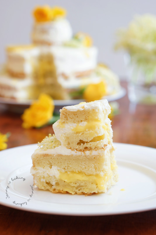 Mind you, this is my very first three-tier cake and no, it is not the original recipe, I deviate in many aspects. It is simply a wedding cake inspired by Meghan’s and Harry’s wedding cake and since the top tier actually was baked in a muffin tin, you can probably imagine it to only feed about 12 people or so. The bottom cake is a 24cm (9inch) cake tin, the top is only a cupcake. A mini version, yet a celebration of these flavors nonetheless. Elderflower and lemon, sweet versus tart, white and yellow happily married in this symphony of spring.