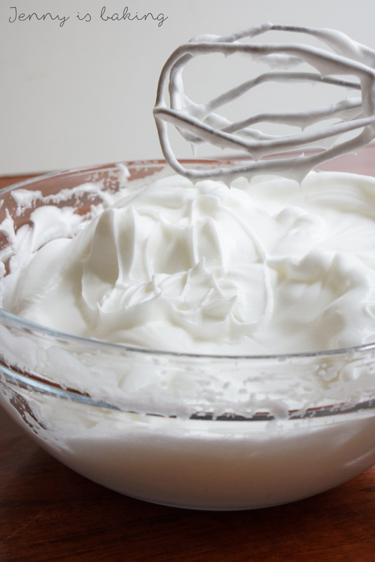 And decided to stick to something I love and which has served me well in the past: sponge roll. Sponge roll with an ultra creamy, yet refreshing filling. So I decided blueberries would serve me well. Yes, you have to turn on the oven, but it is for a mere ten minutes and this cake really doesn’t take that much time to prepare anyway. Trust me. Are you afraid of sponge cake? Don’t be. The most important point is to get the eggs to room temperature. If you forgot to take them out on time, place them in a bowl with warm water for about five minutes. While you wait, prepare your bowls. Pay special attention to the one you wish to use for whipping the egg whites, it has to be completely free of grease. I also recommend weighing all ingredients before you get started because one of the most important aspects of sponge cake to taste like a feather is to very gently fold in the egg yolk mix with the meringue and immediately bake that roll. Don’t let it sit for too long, so make sure to preheat your oven.