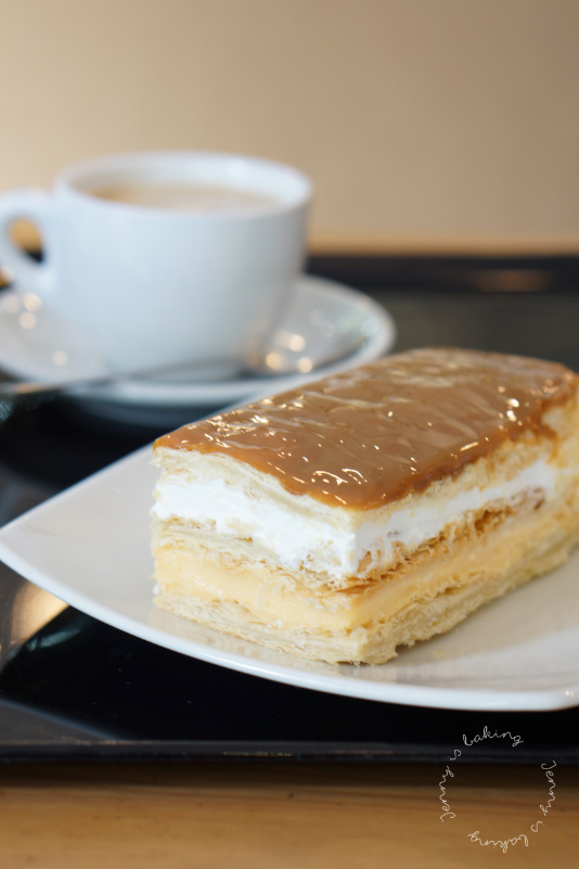 Colombian milhojas, or puff pastry filled with custard and whipped cream