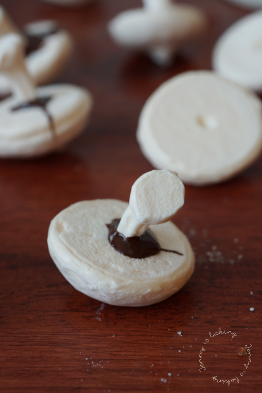 I have to admit, I love fall, especially if you check the ground of a dark forest, you will find mushrooms, just like the ones I am presenting today. No, I am kidding, you won’t find these mushrooms in the forest, they are actually made from meringue. However, I do find that they do look very much like their original, don’t you think? I am sure these mushrooms are going to be a show-stopper. And the best thing is, they are basically made from two ingredients. You beat egg whites with sugar, which you then pipe into mushroom caps and stems, you glue it all together with chocolate, and then dust them off with cocoa powder, voilá!