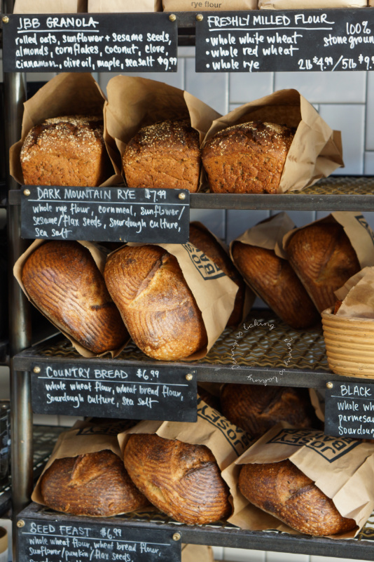 Mein dritter Liebling war The Mill, auch wenn ich im Nachhinein mit Entsetzen feststellen musste, dass es wohl in den höchsten Tönen von Tripadvisor etc. gelobt wird. Irgendwie nimmt das ein bisschen den Charme. The Mill hat sich, wie der Name „die Mühle“ schon sagt, auf Brot spezialisiert, insbesondere bei Toasts hat man die wildesten Auswahlmöglichkeiten von einfachen Marmeladenaufstrichen bis hin zu Pesto oder Mandelbutter. Aber auch das Angebot für Kaffee kann sich sehen lassen. Tritt man in The Mill ein, betritt man Hipsterland, im Hintergrund sieht man in gebatikten T-Shirts Leute direkt Teig kneten, das weitläufige Café wird auch ständig von Fahrradfahrern besucht, die direkt mit Fahrrad an die Tresen treten und bestellen. Der Gründer Josey Baker hat auch ein Brotbackbuch herausgebracht, das laut meinem Mann wirklich gute Rezepte insbesondere für Vollkornweizenbrote produziert und auch alle Angaben in Grammangaben macht, was für ein amerikanisches Backbuch sehr ungewöhnlich ist.