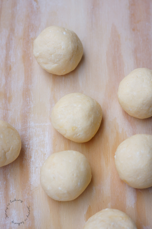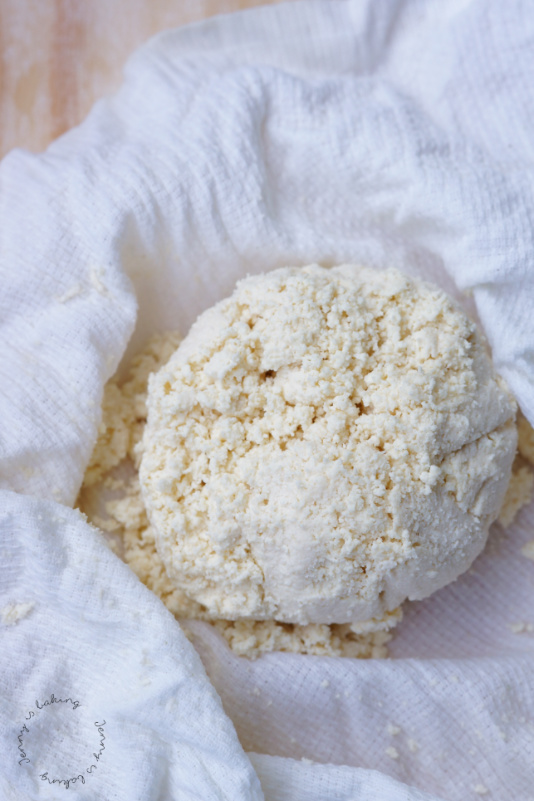 And since I believe you probably won’t be able to find Colombian fresh cheese, which is called queso fresco or queso campesino, I decided to make it myself. Please don’t worry, it is much, much easier than you would think. I promise, it is so easy, only two ingredients required, really not that hard. However, I recommend preparing the cheese the night before so that it gets a chance to dry a little more before using it. But just to be sure I also prepared the cheese once on the same day I made the buñuelos and it worked fine, I just had to add a little more cornstarch to the dough as the cheese still had more moisture. I also tried rolling the buñuelos and frying them the next day, which also worked perfectly. Just be sure to wrap each one separately and chill before frying.