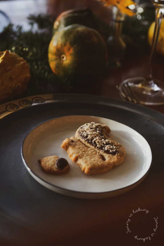 I have been working full-time in HR since we moved. This means that my blog is my creative outlet and my hobby. I had originally planned to offer baking classes. However, due to the move through the entire country I haven’t been able to offer any as of yet. But I am optimistic that this is going to happen soon. I just love baking too much. The last bigger baking project was a “Friendsgiving” we hosted last weekend. No, Thanksgiving is not celebrated in Germany, but we decided to host one anyway. My husband is a really good cook and was responsible for the turked and stuffing (mind you, with homemade bread and chicken broth made from scratch). We served mashed potatos, homemade cranberry sauce (thank you, dear produce vendor that you actually had fresh cranberries available), and an arugula pomegranate salad as the side. For dessert we served this pumpkin layer cake with brown butter buttercream and these cute little squirrel cookies with shortbread dough with additional hazelnuts and chocolate. It was so much fun, I hope you can see that on the pictures.