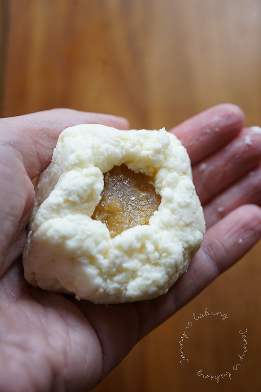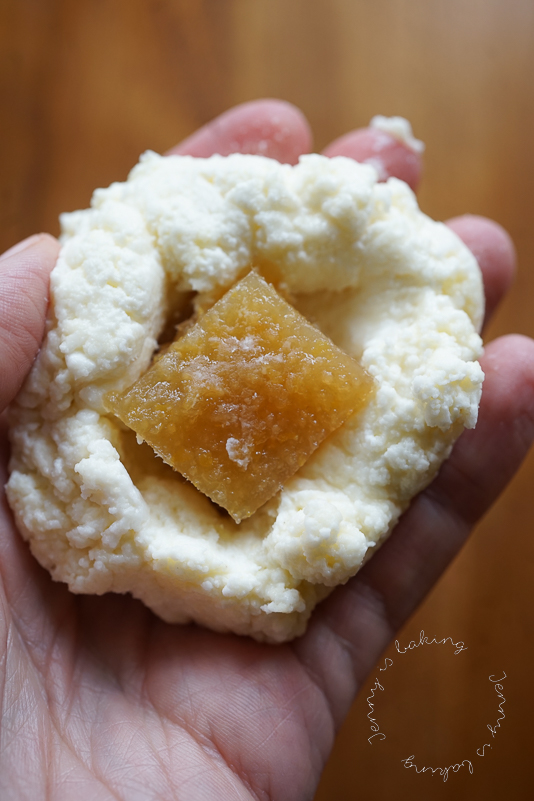 Pandebonos are gluten-free cheese puffs with a quince filling. Line a baking sheet with parchment paper for the pandebonos and preheat oven to 200 degrees Celsius. Melt the butter and set aside. Combine all other ingredients except for the milk and quince paste in a large bowl. As the tapioc starch tends to create a mess once you start mixing, be sure to cover your bowl with a kitchen towel. Mix for about a minute. If the dough is still crumbly, add a bit of milk. If needed, add another tablespoon of milk. Divide the dough in 12 equl parts and roll into balls. Punch a hole into each and press about two squares of quince paste in each (see pictures). Cover the hole and form into balls again. Bake in two batches for about 20-25 minutes, they will still stay pretty light. Serve immediately or within a few hours.Pandebonos with Quince Filling