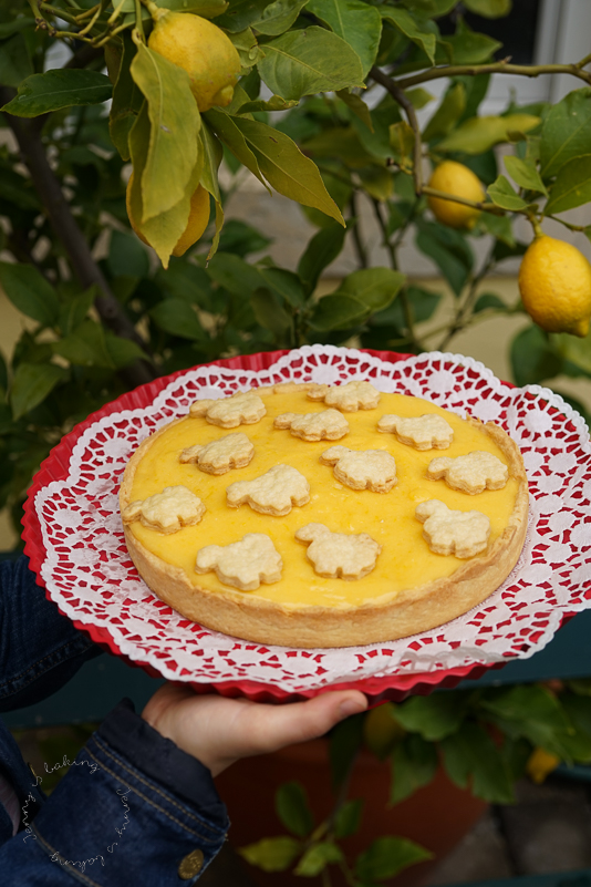 The lemon tart decorated with lambs and made with lemons from their lemon tree