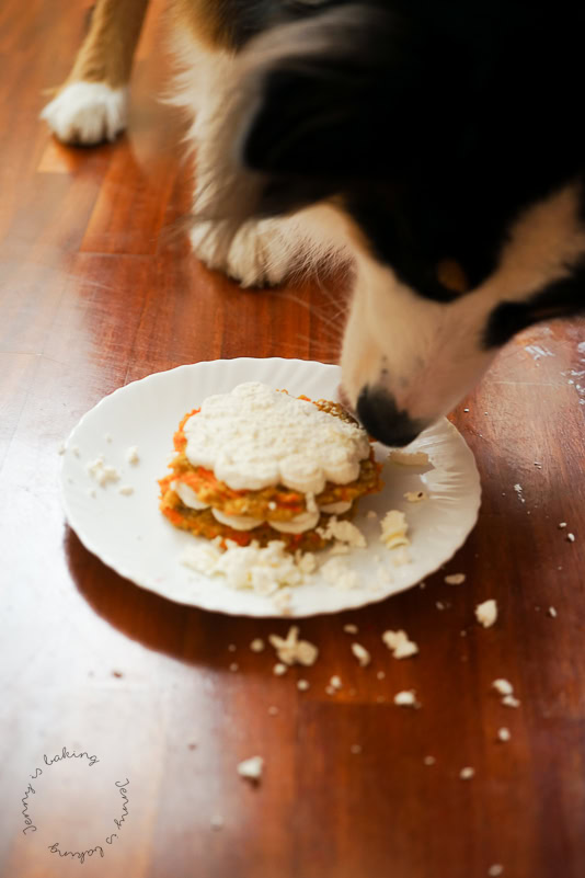 Yes, so far Hazel has gotten a cake for each of her birthdays. I made this dog cake for her first anniversary, the one from year 2 I didn’t put on the blog because I didn’t like it that much. But this time for her third birthday, she did devour it again, so here it comes again. But I would like to make a disclaimer, if you have any concerns about the ingredients used for your dog, please check with your vet. Hazel for example can’t have peanut butter she is allergic, so be sure to keep it safe for your dog.