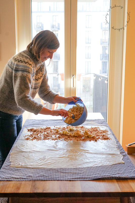 There are two options for making the strudel. You can either only heap up a lot of filling at the very end and create some kind of log, or you can fill about half of the rectangle. Currently I prefer the second method, pictured also here. Using the tablecloth, you want to tuck in the filling so nothing can seep out when you bake it. Trim off any thick parts. Using the tablecloth again, roll up everything to a log and now brush the outside with melted butter. This will again help for a crunchy outside and “seal” the strudel.