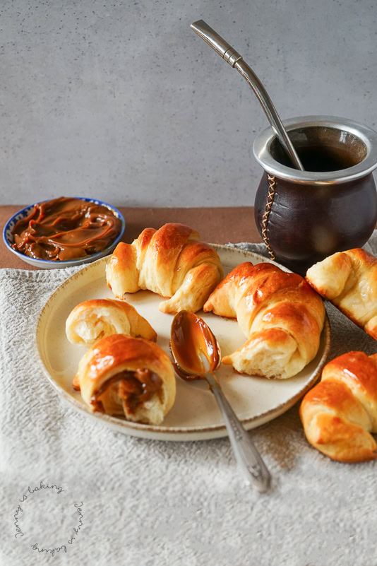 Argentinias took one of the snack times from Spain with them. It is called “merienda” and takes place some time between 4pm – 6pm. You may eat something savory, such as these crackers and sip some mate tea instead of coffee. You may also go the sweet route, I have already introduced the sweet pastries called facturas. Medialunas are also a popular choice. Since dinner is served very late, some time at 9pm or later, it does make sense that you have a snack earlier on. Of course medialunas may also be served for breakfast. You may spread a little bit of the milk caramel dulce de leche on it. Below I give you a list of main differences between medialunas and croissants: