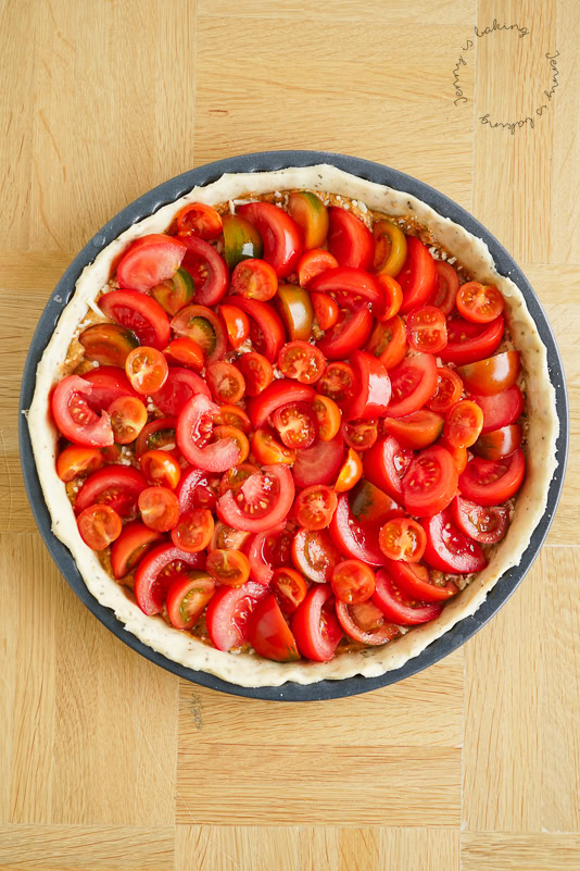 Honestly, I find it a bit surprising, but apparently here in Germany it is currently harvesting time of tomatoes. I was gifted a lot just a few days ago. It was all sorts of tomatoes, many orange, some green. The main pictures actually show these tomatoes I was gifted. The below gallery shows the tart another time with only red tomatoes. You can definitely use a variety of tomatoes, however, I recommend using rather small ones such as a cocktail tomatoe or a cherry tomatoe. You can use bigger ones, but would need to cut them pretty small. The tart may not look as pretty, but will taste just as great.