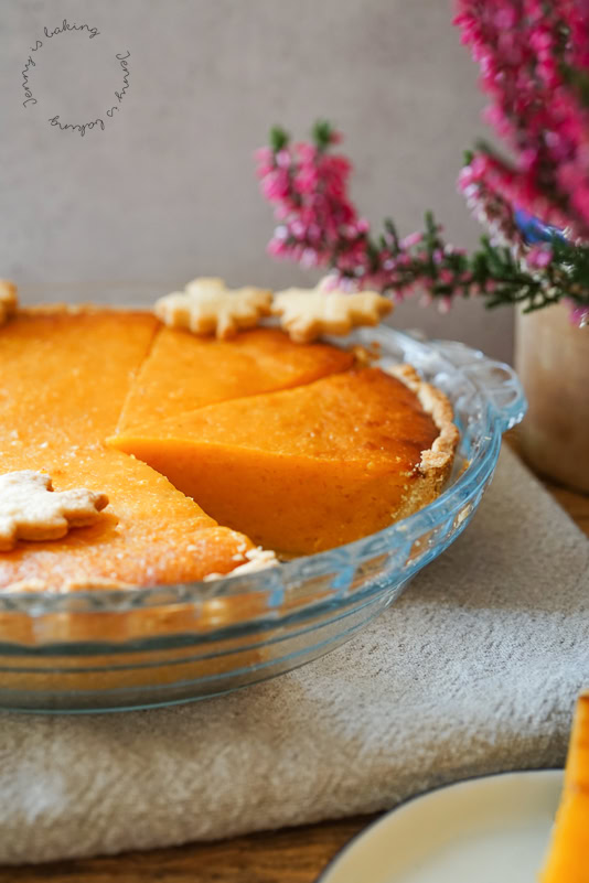 Roll out the dough on a lightly floured surface into a circle larger than your form, I have this one. Place inside and cut of any leftovers. I made maple leaves with the left overs, I use this cookie cutter. Be sure to chill the cookies in the fridge as they need much less time than the pie. Restir the filling and then pour into the prepared pan. Bake for 15 minutes on medium rack, then lower temperature to 180 degrees Celsius for about 30-35 minutes. I place the pie on a baking sheet with the cookies for the last ten minutes. Let cool and decorate with leaves, if making. In the US pie is often served with ice cream or some whipping cream.