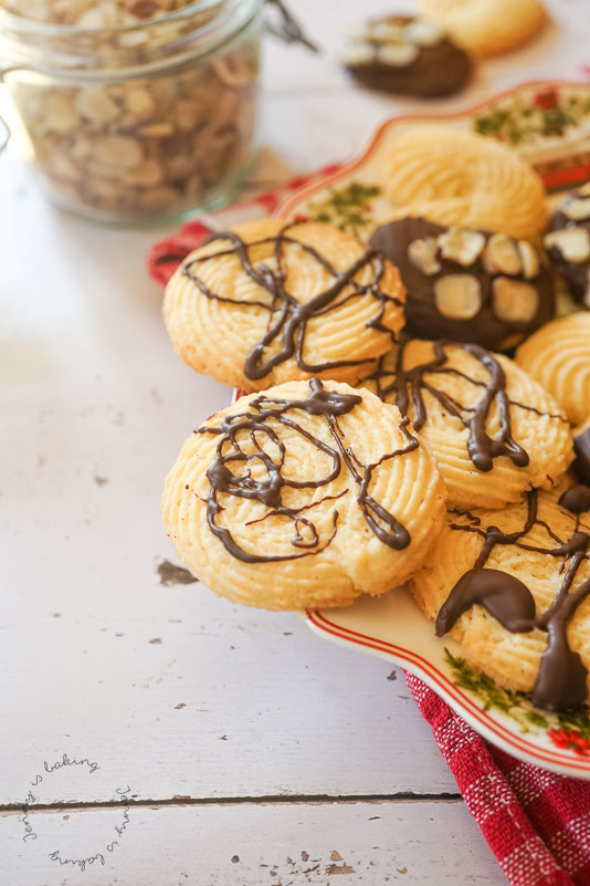 The dough comes together very quickly. If you are not happy with your piping skills, don’t worry, you can simply scrap off any pipings you don’t like and transfer them back into the piping bag. This recipe calls for a slightly lower oven temperature. This will help for the cookies not to spread and for this melt-in-your mouth kind of feel. I decorated mine with chocolate and nuts, but you are free to leave them plain.