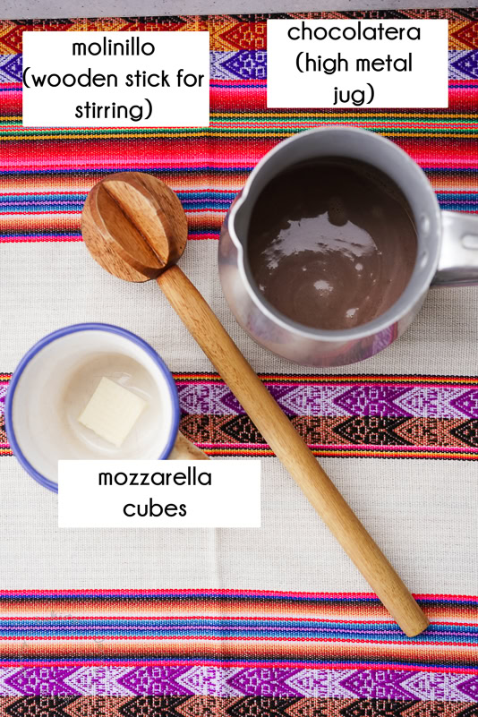 Measure the milk/water with the mug(s) you are going to use and heat in a large pot together with cinnamon stick, if using. When it is almost boiling, reduce heat and add the sugar and chocolate. In Colombia you will use a "molinillo" (see picture), a wooden stick to stir, we will use a whisk instead. Whisk as much air as you can into the mix until frothy. Remove cinnamon stick and pour into mugs. You can either place the mozzarella cubes on the bottom of the mugs and pour the hot chocolate on top or serve them on the side. Most people first drink the hot chocolate and wait for the mozzarella to melt and eat it last. Hot chocolate is usually served for breakfast. For other Colombian breakfast recipes, check out this blog post.