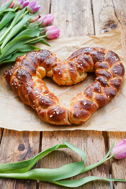 This braided yeast heart is made with very little yeast and thus requires very long waiting times. You will, however, be rewarded a very tasty yeast bread at the end.