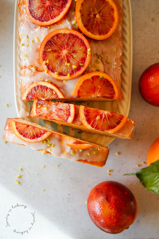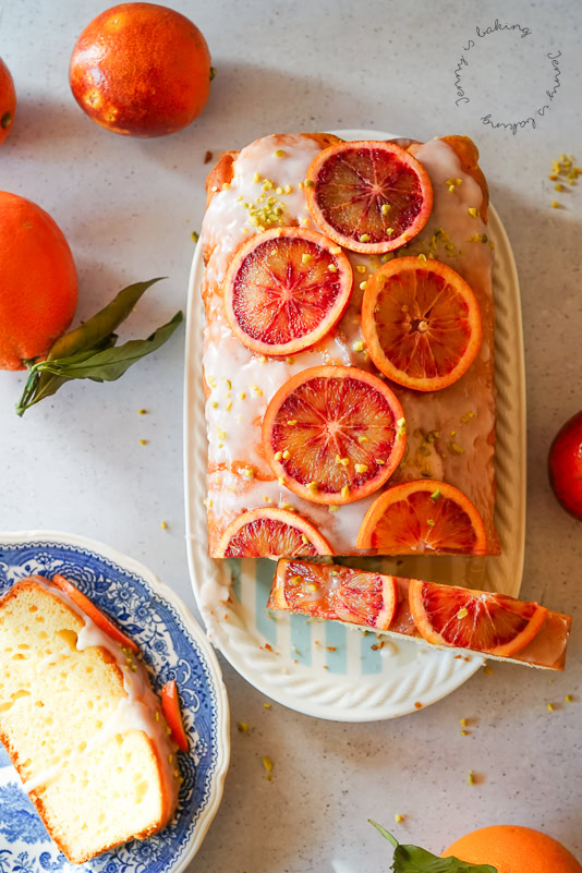 This blood orange pound cake is extra moist by using Greek yoghurt and oil and is soaked in orange juice as well. Preheat oven to 180 degrees Celsius and line a 25cm loaf pan with parchment paper. For the pound cake weigh sugar into a large bowl. Zest the orange(s) on top, juice the orange(s) as well and save the juice. Rub the zest and sugar with your fingers. This helps intensify the orange flavor. Add the eggs and beat for about 3-4 minutes until lighter in color and thicker in consistency. Add 3 tablespoons of orange juice, yoghurt, and oil and mix until combined. Sieve flour, cornstarch and baking powder on top and only beat until combined. Spread in prepared loaf pan and bake on medium rack for about 60-70 minutes. An inserted toothpick should come out clean. Poke the hot cake with a toothpick and soak with another two to three tablespoons of orange juice will still hot. Let cool. Mix the icing sugar with about a tablespoon of orange juice for the glaze. Slowly add more juice until it is liquid enough to glaze the cake with. If desired, you can decorate with slices of blood orange and chopped pistachios. The unglazed cake can be frozen, you can also freeze single slices.Blood Orange Pound Cake