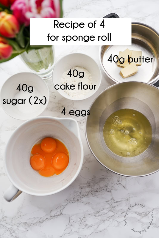 The recipe of four is easy to remember, four ingredients and of each 4 or 40. 4 eggs, 40 grams of cake flour, 40 grams of butter and 40 grams of sugar (twice). This is the recipe I use below and it is enough to full a standard baking sheet. The advantage is that you can spread the batter fully to the rim and don’t need to worry about a smaller pan size. Usually you should be able to get about 8 large slices of cake, if rolling up from the short end. If rolling up from the long end, even more.