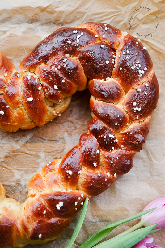 If you are looking for a yeast bread recipe that only requires you to throw together ingredients, look no further. This braided yeast heart may be just for you. No pre-doughs necessary, no extra steps, just letting yeast and time do its magic. But be warned, this recipe requires a total of roughly 8-9 hours. You will have little to do during this time, but you will need to plan accordingly. I even allowed for more time, I first let the dough rise for 6 hours and then placed it already shaped to a heart in the fridge overnight before baking. I was curious, would I taste any difference? I already have a braided yeast bread recipe on my blog that does require pre-doughs, would this recipe be just as good if ingredients are thrown together?