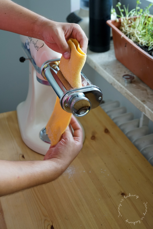 You voted 100% that I post the recipe here when I showed you in an Insta story how we made spaghetti from scratch at home. So here we go, today you will get the recipe for homemade pasta. Obviously they taste so much better than store-bought. And this delicious summer sauce with tomatos, olives, capers, and anchovies, seriously, this is delicious. During my one month break when we moved from Hamburg to Munich I had the chance to eat a lot of homemade pasta. I did learn a thing or two during that time. For example that you really need to knead the dough for a while for the gluten to develop its powers. Or that you need to flour the dough all the time so that the spaghetti doesn’t stick. I mean, I didn’t use a pasta attachment back then, I did everything by hand, rolling it out and cutting the pasta.