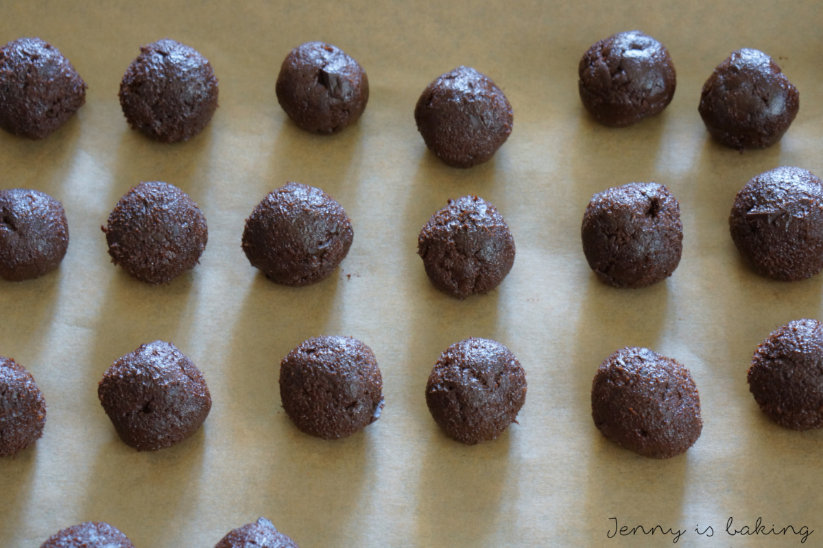 Die Butter in einer großen Schüssel für eine Minute mit dem Mixer cremig rühren. Dann Zuckersorten hinzufügen und nochmals gut cremig rühren. Das Ei hinzufügen und weiter verrühren, Vanilleextrakt hinzufügen und so lange verrühren, bis keine Klumpen mehr zu sehen sind. Das Mehl und den Kakao sieben und mit dem Natron und Salz zur Buttermischung geben. Verrühren bis eine gleichmäßige braune Masse entstanden ist. Milch einrühren und Schokostückchen unterheben. Mindestens für eine Stunde oder über Nacht kühlen. Ofen auf 180 Grad vorheizen und zwei Backbleche mit Backpapier belegen. Pro Cookie einen Esslöffel Teig verwenden, man sollte ca. 24 Cookies in Walnussgröße erhalten. Diese schön rund rollen (siehe Fotos). Auf die Hälfte der Cookies je einen Karamelltoffee setzen und einen zweiten Cookie obenauf. Den Karamell mit den beiden Cookies verschließen, sodass man aus je zwei walnussgroßen Cookies nun einen in der Größe eines Golfballes erhält. Mit allen zwölf Cookies wiederholen. Mit Salz besprenkeln und für ca. 12-14min backen. In der Mitte sollte der Cookie sehr weich aussehen und nur am Rande leicht gebräunt. Auf dem Backblech auskühlen lassen und evtl. mit weiterem Salz bestreuen. Der Teig lässt sich prima einen Tag vorher zubereiten. In dem Fall kann man nach ca. einer halben Stunde die Cookies genießen.