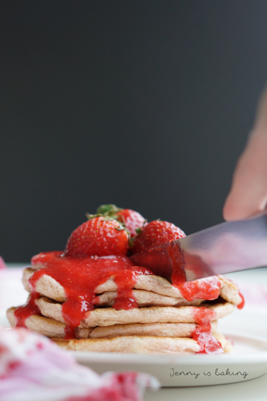 Tja, und weil ich meistens alleine schieße und mein Mann nur in den seltesten Fälle eher mürrisch Handmodel spielt, bin ich also vom Stativ abhängig, wenn ich solche Bilder machen will. Denn dann muss ich selbst ran, per Selbstauslöser und Stativ. Unten siehst du ein paar der Fotos von meinen Erdbeer-Pancakes, bei denen das Stativ mitgespielt hat.