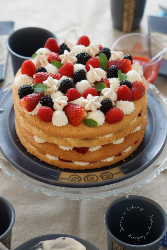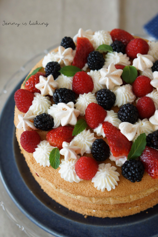 Statt langweiligen Erdbeeren entschied ich mich für die ganze Beerenvielfalt, bei mir gibt es also auch Himbeeren und Brombeeren. Bei der Sahen hab ich nicht viel rumgeschraubt und beim Baiser habe ich kleine Sternchen aufgespritzt, die sind doch niedlich, oder? Ja, und dann gibt es natürlich fluffigen Biskuit, denn der rundet meiner Meinung nach diese Köstlichkeit am besten ab. Verwendet habe ich dazu mein Lieblingsrezept, wenn du lieber eine Biskuitrolle machen möchtest, kann ich meine geliebte Erdbeer-Biskuitrolle empfehlen.