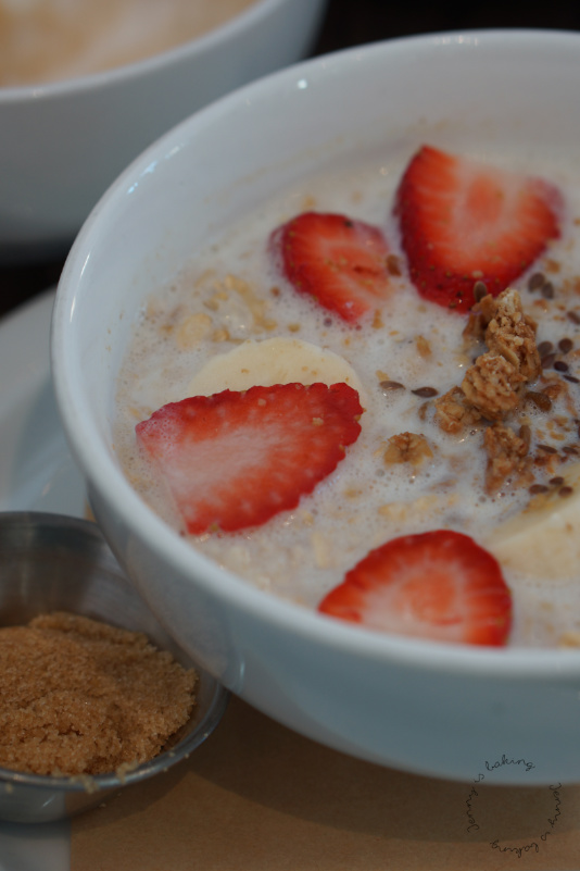 Mein zweites Lieblingscafé in San Francisco wurde mir von unserem Gastgeber empfohlen, auch La Boulangerie hat, wie der Name schon sagt, viele französisches Kleingebäck im Angebot, allerdings habe ich mich gar nicht so sehr an den Croissants, Brioches und ähnlichem gütlich getan, sondern mich auf das Frühstück gestürzt. Als ich sah, dass ich meine geliebten „rolled oats“, also Haferflocken mit Früchten, Nüssen und wenn man mag auch mit veganer Milch bestellen konnte, war es um mich geschehen. Ja, ich bin nun auch wild entschlossen diese interessante Mischung zwischen körnigen Haferflocken, die aber irgendwie gleichzeitig zart sind, hinzukriegen, die dann in Milch aufgekocht werden, aber im Gegensatz zu rolled oats nicht über Nacht stehen bleiben, sondern frisch verzehrt werden. Sollte das klappen, werde ich natürlich umgehend berichten.