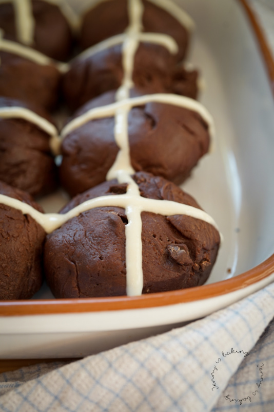 Und ich muss sagen, es war alles ziemlich einfach. Im Nachhinein habe ich festgestellt, dass ich hätte den Vorteig eigentlich kneten sollen, ups, das habe ich irgendwie überlesen, geklappt hat es trotzdem. Auch waren meine Gehzeit länger, ich glaube zweieinhalb Stunden habe ich den Teig beim ersten Mal gehen lassen, auch die fertigen Brötchen habe ich beim zweiten Gehen eine Weile ruhen lassen. Dass aber mein Mann, der unangefochtene Brotbäcker unserer Familie, sich gleich ein noch warmes Schoko-Brötchen stibitzt hat, das will was heißen! Wirklich super leckeres Rezept, muss ich schon sagen. Und deshalb präsentiere ich hier ganz stolz diese besonders schokoladigen Cross-Buns.