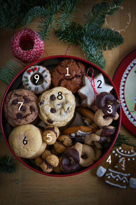 Ich finde, wenn man sich die Mühe macht und eine Dose verschenkt, dann sollte es mindestens drei verschiedene Plätzchen geben. Nach oben hin gibt es keine Grenze, aber ich habe bisher spätestens bei dem neunten Rezept aufgehört. Weniger, weil ich keine Lust mehr hatte zu backen, sondern weil ich gemerkt habe, dass die Leute sonst überfordert sind und vor lauter Auswahl nicht wissen welchen Keks sie essen sollen. Außerdem wird man kaum mehr Kekse einer Sorte in die Keksdose quetschen können, die ist deutlich schneller voll als man denkt. Wenn man sich erst einmal langsam ranwagen will, dann empfehle ich ein klassisches Rezept zu wählen (siehe oben), eines mit Schokolade und eines seiner Wahl.