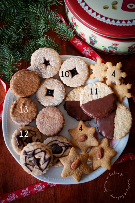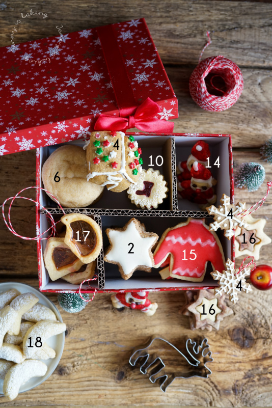 Klassiker: Vanillekipferl, Lebkuchen, Zimtsterne, Pfeffernüsse, Spekulatius, Heidesand, Butterplätzchen mit Zuckerglasur, Nussecken oder Linzer (nicht für Post-Päckchen geeignet)