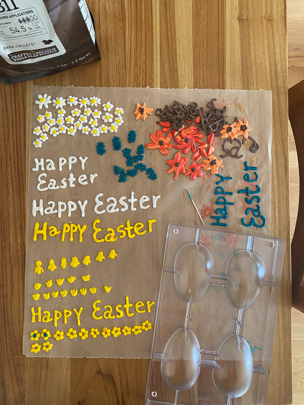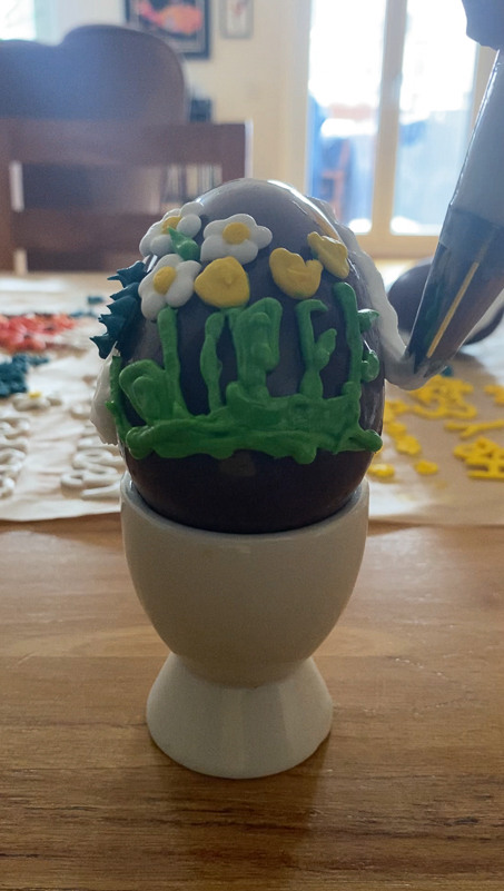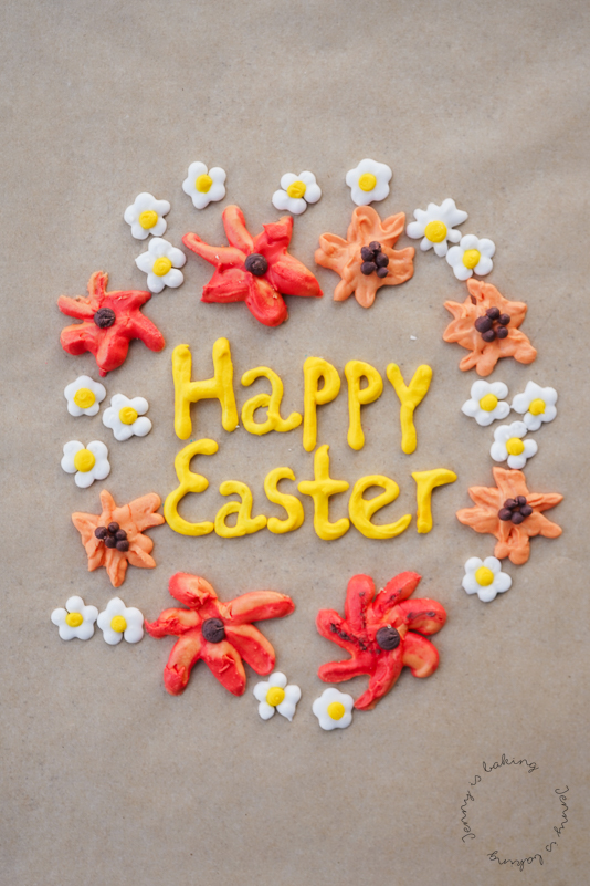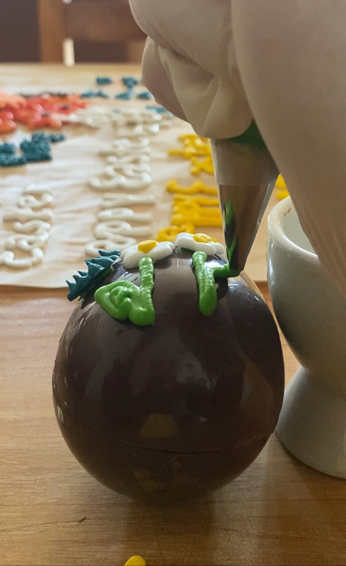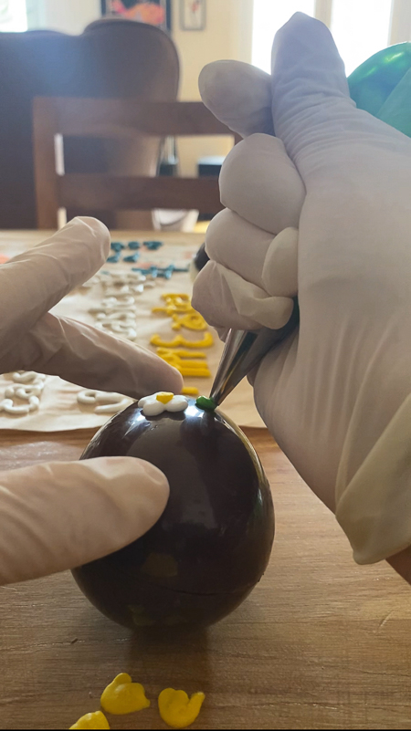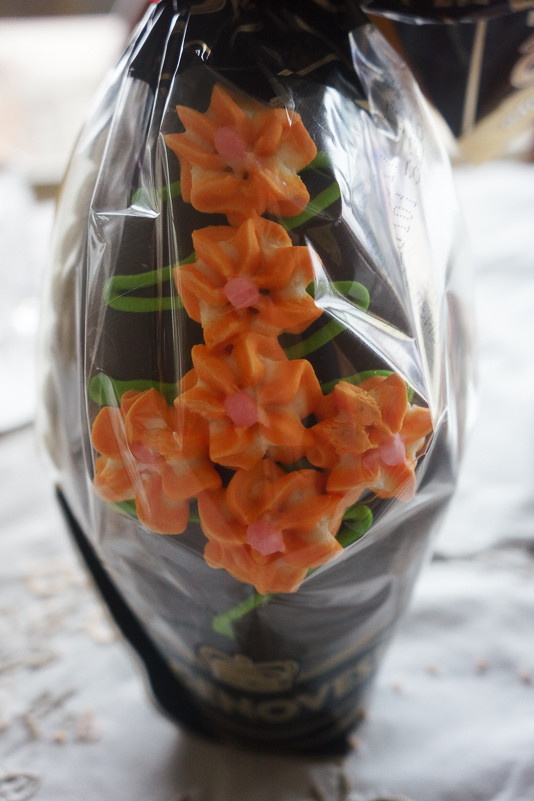 Aber jetzt nochmal von Vorne. Als Kind gab es in Uruguay zu Ostern traditionell immer Schokoeier, die wunderschön verziert waren. Das untere Bild stammt aus dem Jahr 2016, als wir zu Ostern in Uruguay waren und ich zu meiner Freude immernoch dreißig Jahre später diese Schokoeier im Laden in Uruguay vorfand. Ich fragte mich, aus welchem Material wohl die Blumen waren. Relativ schnell fand ich dann heraus, dass es die gute alte Eiweißglasur ist, also Puderzucker und Eiweiß, d.h. durch die ganzen Lebkuchenhäuser und Oktoberfestherzen und ähnliches hatte ich schon viel Erfahrung damit. Bis dato hatte ich nur noch nie eine so dicke Glasur vorbereitet, dass sie quasi steht, denn nur so kann man damit Blumen formen. Aber nachdem ich ein wenig herumprobiert habe, hatte ich den Dreh raus. Die Antwort lautet: weniger Eiweiß, dafür noch mehr Puderzucker!