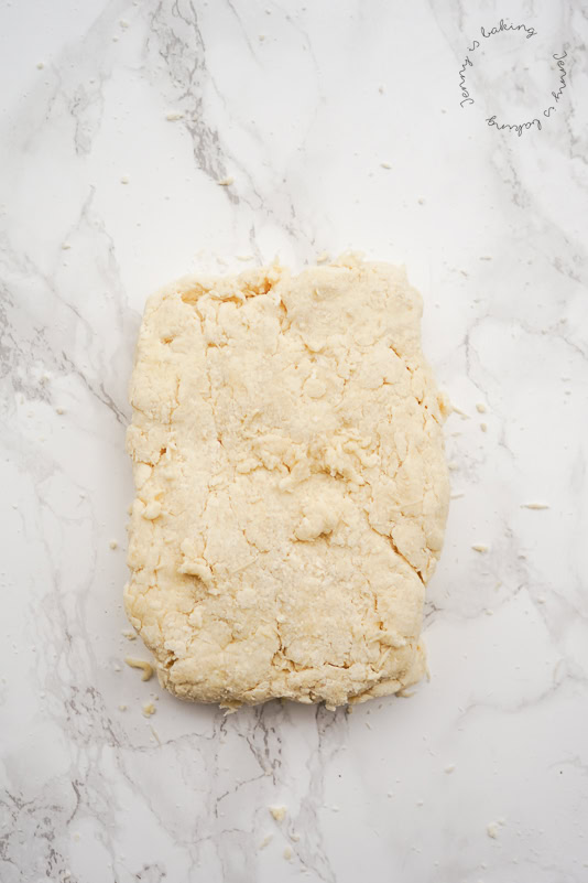 Den Teig habe ich mit einer Gabel „verrührt“, man sieht, er ist noch ziemlich krümlig, auf der Arbeitsplatte habe ich ihn kurz durchgeknetet und dann zu einem Rechteck zusammengedrückt.