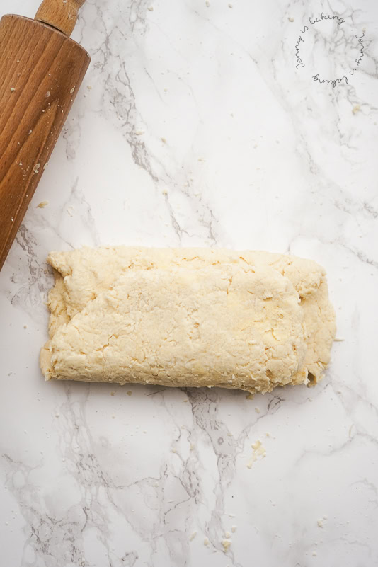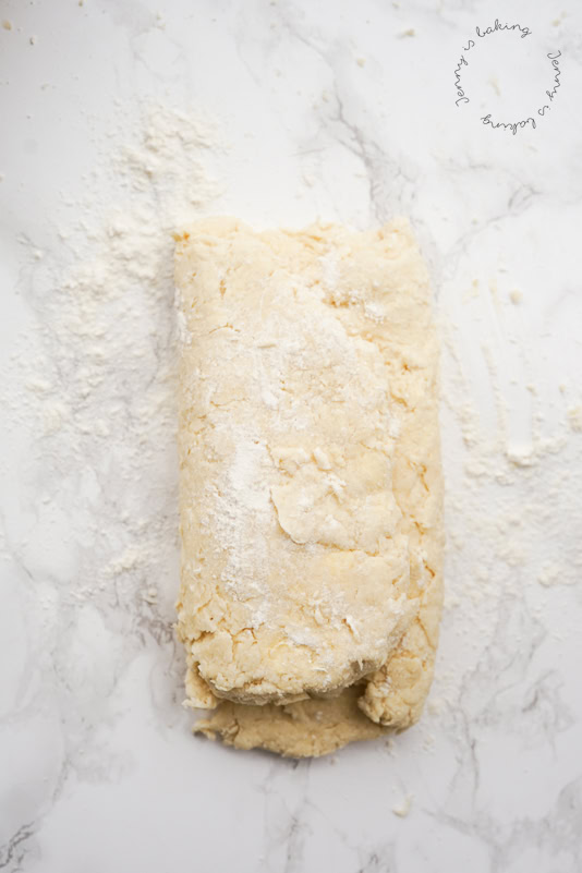 Hier in der Reihenfolge wie der Teig aussehen sollte und wie man touriert, ich hoffe, das die Bilder beim Nachmachen helfen (hier sind zwar „normale Scones“ abgebildet, aber der Prozess ist identisch):