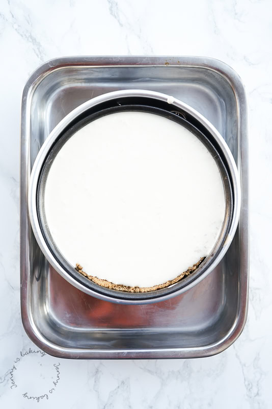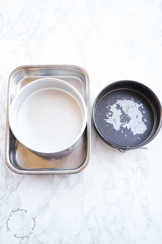 Mein Trick für’s Wasserbad: einfach die Springform in eine leicht größere Kuchenform stellen, dann muss man nicht mit Aluminiumfolie rumhantieren