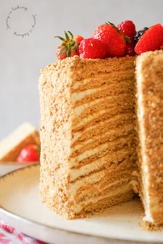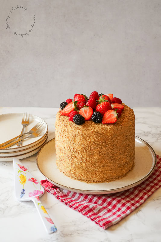 Heute stelle ich den Cousin der russischen Napoleon-Torte vor: Medowik bzw. Honigtorte. Genau wie bei der Napoleon-Torte gibt es hier zwölf Teigschichten, die aus einem Honigteig erstellt werden. Auch hier gibt es diverse Optionen, was man als Füllung hernehmen kann. Ich entschied mich für die klassische Schmandfüllung. Genau wie bei der Napoleon-Torte krümelt man die Teigreste fein und klebt sie außen an. 12 Teigplatten zu erstellen dauert seine Zeit, deshalb sei vorgewarnt. Belohnt wird man dafür mit einer vollmundigen Torte. Ich mag normalerweise eher fruchtige und frische Torten, aber wenn ich mir bei so einer Torte Nachschlag hole, will das wirklich was heißen. Ich stelle hier sehr bewusst eine Torte mit kleinerem Durchmesser vor, 18cm ist sie, aber dafür ziemlich hoch. Von einem Stück wird man sehr gut satt, man kann also wirklich schmale Stücke schneiden.