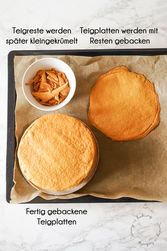 Auch wenn ich Teigplatten von 18cm ausgeschnitten habe, so hat es dennoch über eine Stunde gedauert bis ich alle 12 Teigplatten gebacken habe. Deshalb sei vorgewarnt, für diese Torte braucht man definitiv Zeit. Vorteil ist jedoch, dass man mindestens einen Tag vorher starten muss, da die Torte am besten über Nacht durchziehen sollte. Man kann super noch früher starten, solange man die Teigplatten nicht füllt, kann man sie einfrieren oder luftdicht verpackt einige Tage im Kühlschrank lagern. Die Füllung zu erstellen dauert nicht lange.