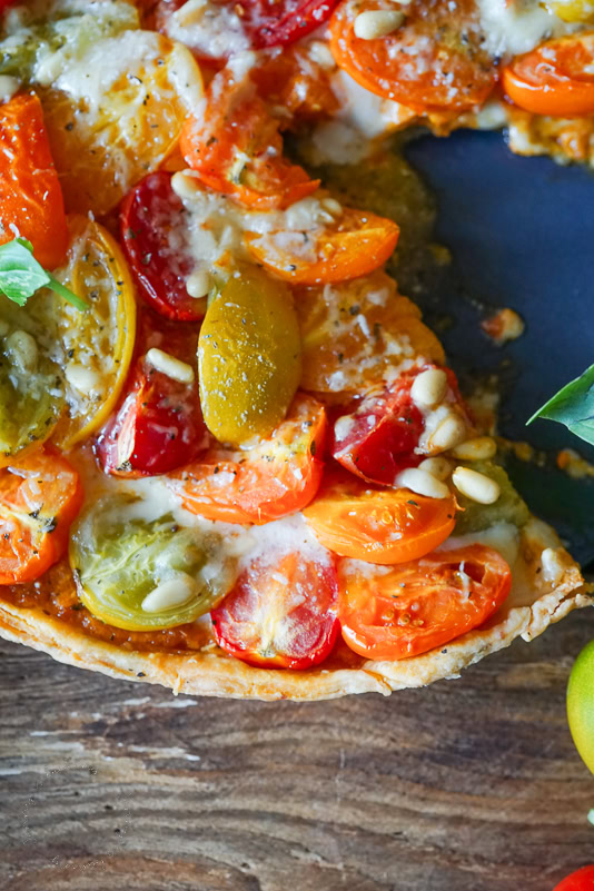 Heute gibt es eine leckere Tomaten-Tarte mit selbstgemachtem roten Pesto und natürlich einer dicken Schicht Tomaten! Wenn man auch das Pesto zubereitet, ist das mehr als ein Kilo Tomaten, was man da verarbeitet. Letztes Jahr habe ich zunächst das rote Pesto mit frischen Tomaten auf den Blog gestellt. Das Rezept ist super populär bei euch. Dieses Jahr schaffe ich es endlich auch meine geliebte Tomaten-Tarte, bei der auch das Pesto zum Einsatz kommt, vorzustellen. Sie besteht aus einer Schicht herzhaftem Mürbeteig, einer Schicht mit dem Pesto, einer Schicht frischen Tomaten und als Abschluss Käse und Pinienkerne. Ich mag diese Tarte super gerne, ich mache sie jedes Jahr mehrere Male. Hoffentlich habt ihr auch so viel Freude an dieser Tarte wie ich.
