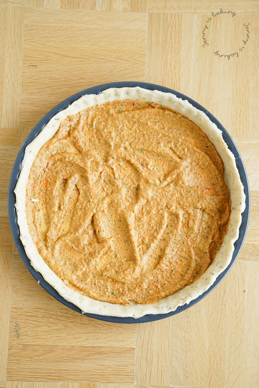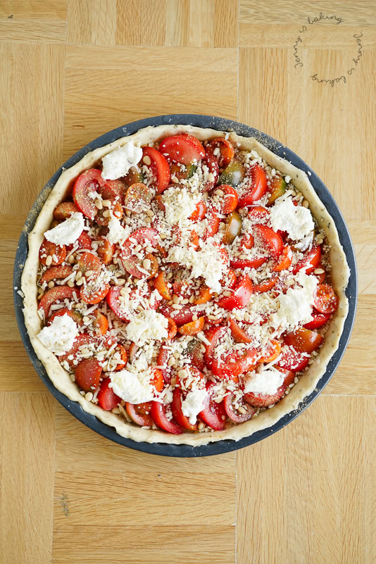 Das Rezept ist schnell erklärt: man schichtet rotes Pesto, Tomaten und Käsesorten zu einer Art Pizza, Grundlage ist hier jedoch ein Mürbeteig, den ich gerne mit etwas Oregano und Parmesan verfeinere. Den Teig kann man bequem am Vortag zubereiten, natürlich auch das Pesto, wenn man es selbst macht. Aber ein gekauftes Pesto tut es natürlich auch. Zur Not kann man es auch weglassen, ich hätte dann nur Sorge, dass der Teig durchsuppt, da die Tomaten ja doch ziemlich viel Flüssigkeit enthalten. Ich bin meist zu faul den Teig vorzubacken, aber wenn man ganz sichergehen will, wirkt dem das sicher entgegen.