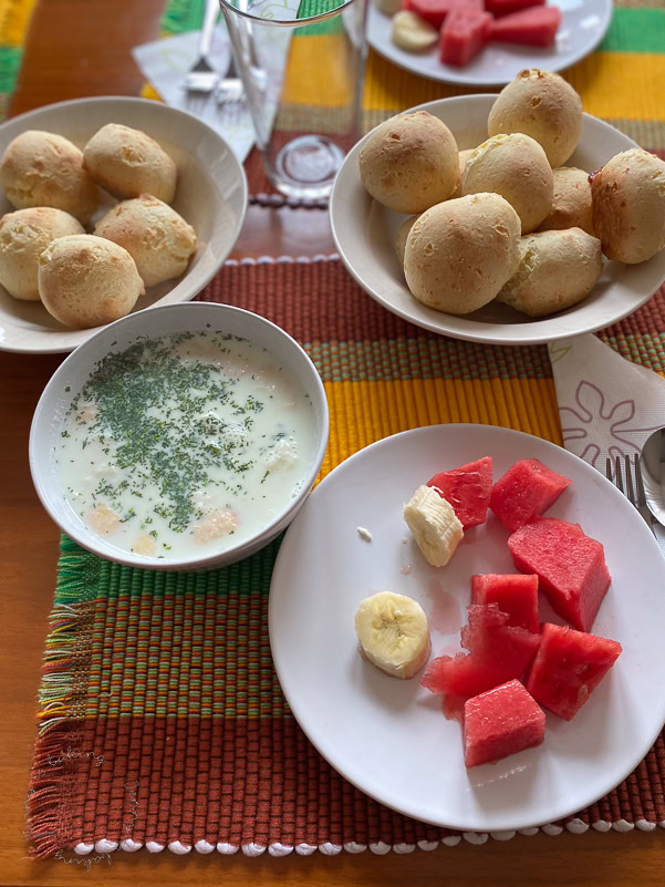 In Kolumbien gibt es vorrangig eher milde Käsesorten, wie z.B. Mozzarella. Käse spielt beim Frühstück eine wichtige Rolle, sowohl als Füllung in arepas, aber auch um pan de bonos oder pandebonos zu erstellen. Dafür verwendet man einen Fischkäse namens „queso campesino.“ Diese kleinen Käsebällchen serviert man gerne mit frisch gebrühtem Kaffee oder „chocolate caliente„, also heißer Schokolade. Selbst in die heiße Schokolade kommen Käsewürfel. Von meinen deutschen Freunden kommen dann irritierte Blicke, aber wenn man daran denkt, dass ein milder Käse wie Mozzarella verwendet wird, versteht man vielleicht, dass dieser quasi Sahneersatz in der heißen Schokolade ist. Auf dem Foto unten abgebildet ist auch noch „changua“, eine Milchsuppe mit pochierten Eiern (klar), Frühlingszwiebeln und Brotwürfeln. Zwar habe ich das auch schon gegessen, aber mag es nicht sonderlich, weshalb es auch noch kein Rezept auf dem Blog dazu gibt.