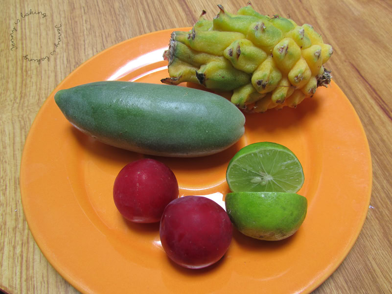 Links zu sehen sind von oben nach unten pitaya (Drachenfrucht), curuba (auf Englisch banana passionfruit), ciruela (Pflaumen), limón (Limetten), rechts ein typischer Früchte- und Saftstand