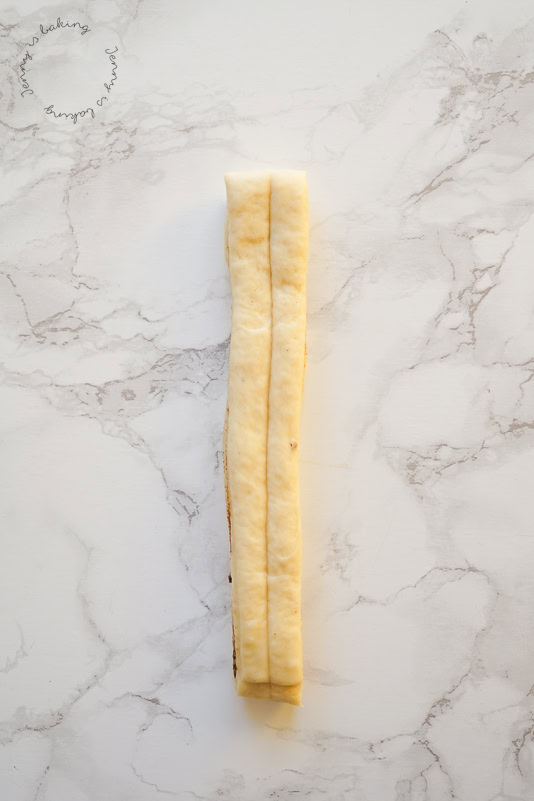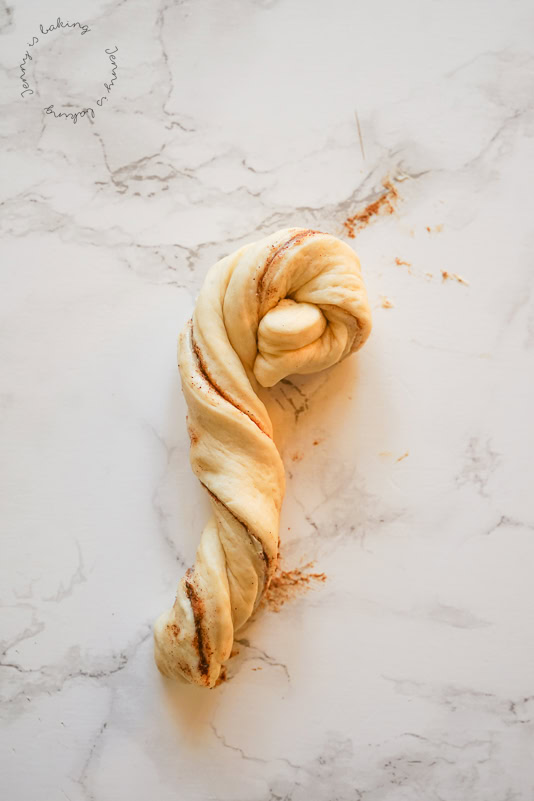 Kanelbullar, das sind schwedische Kardamom-Zimt-Knoten, die aus einem süßen Hefeteig bestehen und dann mitsamt einer Zimt- und Kardamomfüllung zu einem Knoten geformt werden. In diesem kurzen Video sieht man wie ich sie zubereite. Für den Teig zunächst den Kardamom mahlen, die Hülle entfernen und einen TL beiseite stellen. Die Milch leicht erwärmen, man sollte noch den Finger hineinstecken können. Die Hefe darin auflösen. Dann alle Zutaten für den Teig in eine große Knetschüssel geben und entweder per Hand oder mit der Maschine ca. 10min zu einem weichen, elastischen Teig kneten, der sich gut von der Schüssel löst. Ca. eine Stunde oder bis sich das Volumen verdoppelt hat mit einem feuchten Tuch abgedeckt gehen lassen. Falls noch nicht geschehen, die Butter für die Füllung herausnehmen. Kardamom für die Füllung wie oben mahlen und mit dem Zimt vermischen. Sobald der Teig fertig ist, einboxen, damit die Luft entweichen kann. Auf einer leicht bemehlten Arbeitsfläche zu einem Rechteck von ca. 35x60cm ausrollen, auf 2/3 des Rechtecks die Butter verteilen und dann Zimt und Kardamom darauf verstreichen. Nun wie einen Geschäftsbrief falten, den "leeren" Teil als letztes drüberfalten. Nochmal zu einem Rechteck ausrollen und von der Längsseite in dünne Streifen von ca. 3cm schneiden, ich hatte zehn Streifen. Jeden Streifen nochmal vertikal einschneiden, aber nicht komplett durchschneiden. Diesen Streifen in sich verdrehen (siehe Fotos) und dann zu einer Schnecke aufrollen. So mit allen Streifen verfahren. Auf ein Backblech mit Backpapier legen, mit einem feuchten Tuch abdecken und nochmal ca. 30-40min gehen lassen. Kurz vor dem Backen habe ich die Enden nochmal vorsichtig miteinander verklebt, damit die Schnecken nicht auseinandergehen. Währenddessen den Zuckersirup zubereiten. Dazu Wasser und Zucker in einem kleinen Topf aufkochen, sobald der Zucker sich aufgelöst hat, beiseite stellen. Ofen auf 220 Grad Ober- und Unterhitze vorheizen, Kanelbullar mit dem Ei bepinseln und Hagelzucker bestreuen. Ungefähr 13min backen oder bis sie goldbraun sind. Noch warm mit dem Zuckersirup bepinseln. Wie jedes Hefegebäck schmecken sie am besten frisch gemacht.Kanelbullar - schwedische Kardamom-Zimt-Knoten