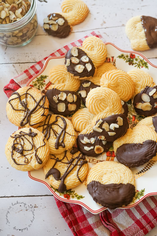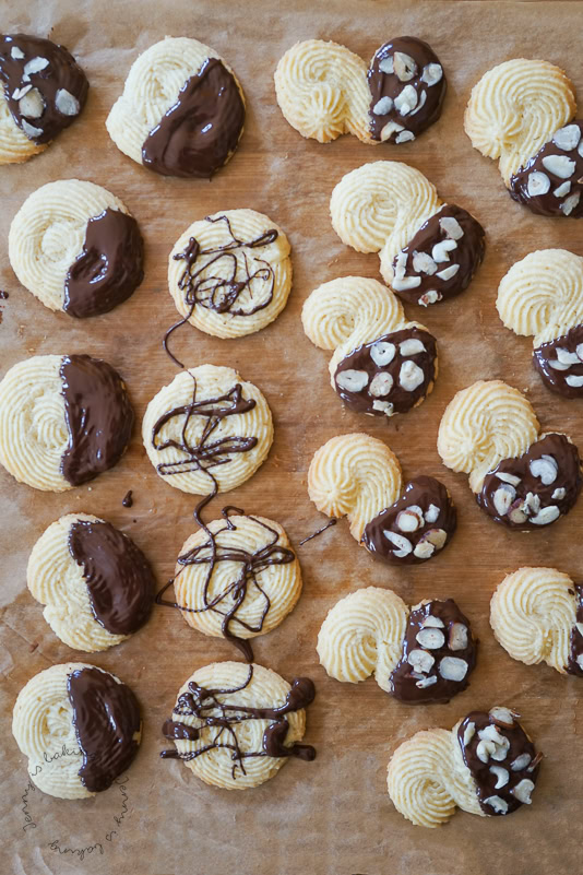 Der Teig ist schnell zusammengerührt und wer mag, kann auch unschöne Plätzchen einfach wieder abkratzen, zurück in die Spritztüte geben und nochmal üben, denn das gleichmäßige Spritzen ist wahrscheinlich das Schwierigste an diesen Plätzchen. Dass wir sie bei 160 statt 180 Grad backen, liegt einfach daran, dass sie dadurch weniger verformen und wunderbar auf der Zunge zergehen. Ich habe mich beim anschließenden Dekorieren mit Schokolade und gehackten Haselnüssen ausgetobt. Natürlich kann man sie aber auch einfach pur servieren.