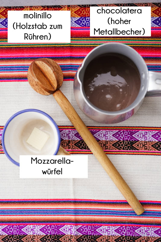 Kolumbianische heiße Schokolade wird mit Mozzarellawürfeln serviert. Die Milch und Wasser pro Tasse abmessen und in einen Topf mit der Zimtstange geben, langsam erhitzen und fast bis zum Kochen bringen, dann Temperatur reduzieren und die Schokolade und den Zucker hinzugeben. In Kolumbien hat man einen hohen Metallbecher (chocolatera) und ein besonderes Holzrührgerät (molinillo), in Deutschland tut es ein Topf und Schneebesen, um die Schokolade zu schmelzen. Es ist gewollt, dass man möglichst viel Luft einarbeitet, entsprechend ordentlich den Schneebesen verwenden. Ggf. Zimtstange entfernen. In die Tasse(n) abfüllen und mit dem in Würfel geschnittenen Mozzarella servieren. Je nach Vorliebe lässt man den Käse erst schmelzen und löffelt ihn am Ende oder isst ihn zwischendurch mit der heißen Schokolade mit. In Kolumbien serviert man heiße Schokolade sehr gerne zum Frühstück, weitere kolumbianische Frühstücksideen gibt es hier.Kolumbianische heiße Schokolade mit Mozzarella