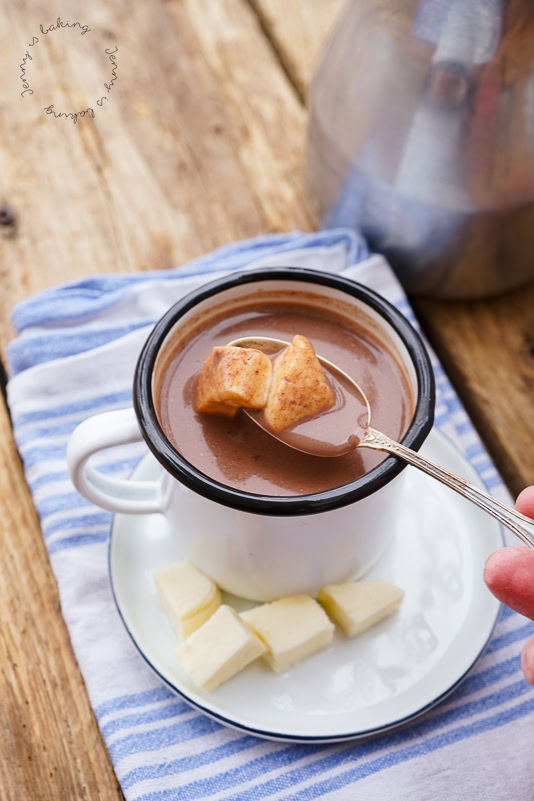 Man kann entweder die Käsewürfel direkt in die Tasse legen und die heiße Schokolade drübergießen oder die Würfel erst später eintunken
