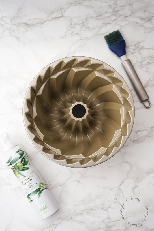 Das A und O ist die Form gut einzufetten. Ich mache das mittlerweile am liebsten mit einem neutralen Öl, denn Butter hat die Eigenschaft, dass sie sich dann doch gerne mit dem Teig verbindet. Abgebildet ist hier ein Olivenöl-Spray, das ich aus Spanien mitgebracht habe, es tut aber auch ein neutrales Öl wie z.B. Sonnenblumenöl. Stelle sicher, dass du auch wirklich jede Kante und Ecke sowie den Schlund in der Mitte gut einfettest, ein Pinsel kann da sehr helfen in schwierige Ecken zu kommen. Mittlerweile bemehle ich meine Form nicht mehr, das scheint eher kontaproduktiv zu sein, ich verwende maximal Semmelbrösel, wenn ich die zur Hand habe oder aber Kakao für einen Schokoladen-Gugelhupf. Falls du keine Semmelbrösel für einen hellen Gugelhupf zur Hand hast, reicht das Einfetten erst einmal aus.