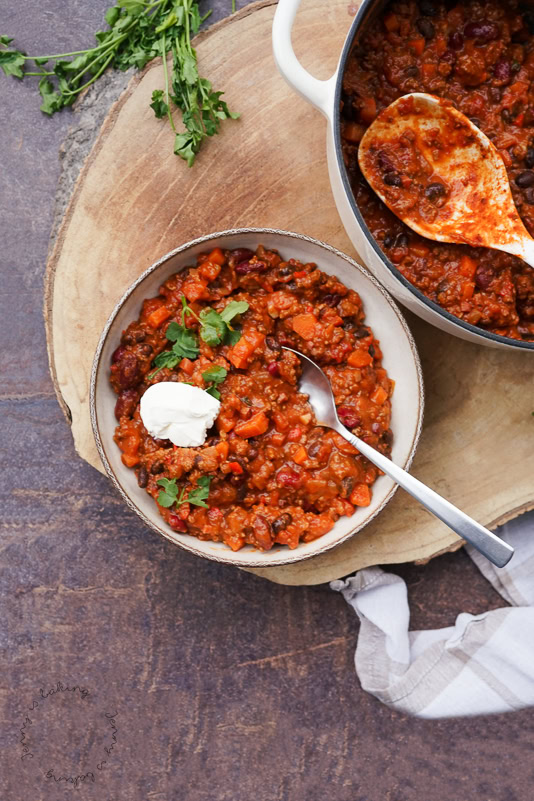 Ich sag jetzt was Ketzerisches: Für mich ist Chili con Carne definitiv ein amerikanisches Gericht, Texmex, wenn man so will. Soweit ich weiß, haben weder die Mexikaner, noch die Spanier Anspruch auf dieses Rezept genommen, sondern es ist so amerikanisch, dass sogar unterschiedliche Staaten (Texas und Illinois) es zu ihrem eigenen Staatengericht deklariert haben, auch wenn der Inhalt des Chilis unterschiedlicher nicht sein könnte. Auch Oklahoma und Cincinnati haben ihre ganz speziellen Versionen. Weitere Infos gibt es in diesem Artikel (auf Englisch). Ich halte mich raus aus der Diskussion, ob man Tomaten, Bohnen oder Mais zu einem Chili hinzufügen darf oder nicht. Meine Version enthält sowohl Tomaten als auch Bohnen, aber kommt ohne Mais aus, man kann sicher weitere „Füller“ wie Süßkartoffel und Kürbis hinzufügen.