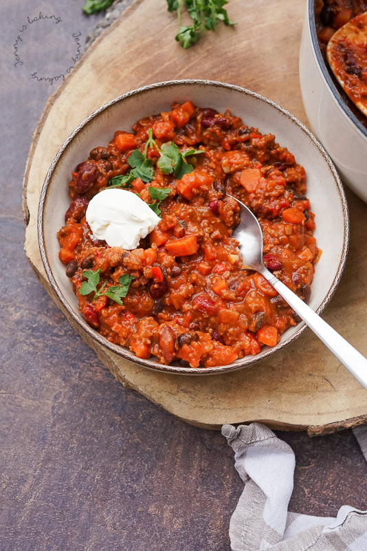 Egal für welche Variante man sich final entscheidet, Chili con Carne ist für mich ein wunderbar wärmendes Wintergericht. Man kann große Mengen einfrieren und mehrere Male davon essen, natürlich abhängig wie viele Esser dabei sind. Ich serviere es eigentlich immer mit Reis, auch Avocado schmeckt dazu. Natürlich kann man auch Schmand, frisch gehackten Koriander als auch geriebenen Mozzarella dazu servieren. Meine Variante enthält sowohl Chilipulver als auch Chiliflocken, ich empfehle auf jeden Fall nach Geschmack abzuschmecken, ich glaube, für deutsche Verhältnisse ist meine Variante schon recht scharf.