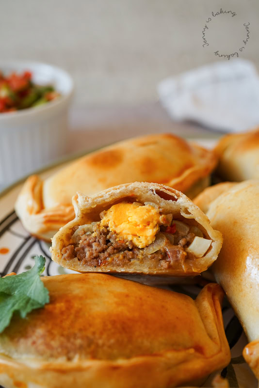 Empanadas de pino aus Chile bestehen aus Fleisch, karamellisierten Zwiebeln, Sultanien, Oliven und hartgekochten Eiern. Für den Teig die Milch erwärmen, derweil alle anderen Zutaten bis auf das letzte Ei in eine große Knetschüssel abwiegen. Die warme Milch hinzugeben und alles per Hand oder mit der Maschine ca. 5-8min zu einem glatten Teig verarbeiten. Mindestens eine halbe Stunde abgedeckt ruhen lassen oder luftdicht verpackt über Nacht im Kühlschrank kühlen. Für die Füllung die Zwiebeln schälen und fein schneiden und in etwas Ölivenöl zunächst einige Minuten anschwitzen. Dann ein Stückchen Butter einrühren und alles auf niedriger Hitze unter Rühren ca. eine halbe Stunde karamellisieren lassen. Sollten die Zwiebeln anfangen anzubrennen, einen Schluck Wasser einrühren. Zwiebeln aus der Pfanne nehmen und das Hackfleisch in der gleichen Pfanne auf höherer Hitze von allen Seiten scharf anbraten und bräunen. Dann die Zwiebeln wieder hinzugeben und mit allen Gewürzen abschmecken. Mehl hinzugeben und ca. zwei Minuten unter Rühren andünsten, dann die Brühe einrühren und einmal kurz aufkochen lassen, Hitze reduzieren und ca. zwei Minuten andicken lassen. Alles abkühlen. Man kann die Füllung so vorbereitet am Vortag machen. Die Sultanien erst einrühren, wenn die Masse abgekühlt ist. Die Eier kochen, schälen und in Stücke schneiden und die Oliven halbieren. Ggf. die Füllung nochmal abschmecken. Die Salsa kann man gut ein bis zwei Tage vorher zubereiten, je länger sie ziehen kann, desto besser wird sie. Tomaten feinwürfeln, Frühlingszwiebeln und Chili in Ringe schneiden, Knoblauch und Koriander fein hacken. Alles zusammen mit den weiteren Gewürzen in ein Schüsselchen geben und vermischen, ggf. noch etwas abschmecken. Den Teig halbieren, eine Hälfte zurück luftdicht verpackt in den Kühlschrank geben und den Rest auf einer bemehlten Arbeitsfläche sehr dünn (ca. 1-2mm) ausrollen. Kreise von ca. 13-15cm ausschneiden, ich mache das mit einer Müslischüssel. Ca. 2-3 TL der Füllung auf der einen Hälfte vom Kreis verteilen, zwei Olivenhälften ebenfalls hinzugeben. Mit dem Finger den Kreisrand mit Wasser einstreichen, dann die leere Kreishälfte über die gefüllte Hälfte klappen und den Rand überall fest zudrücken. Beide Seiten vom Halbmond zur Mitte hin umklappen und den oberen Rand ebenso (siehe Fotos). So vorbereitet kann man die Empanadas luftdicht verpackt und auf Backpapier liegend im Kühlschrank über Nacht kühlen oder aber auch einfrieren. Den Ofen auf 200 Grad Ober- und Unterhitze heizen, die Empanadas mit einem verquirlten Ei bestreichenund auf ein mit Backpapier belegtes Backblech legen, ca. 25min goldbraun auf mittlerer Schiene backen. Gefroren brauchen sie mindestens 5min länger im Ofen. Warm z.B. mit einem frischen Salat servieren.Empanadas de pino aus Chile