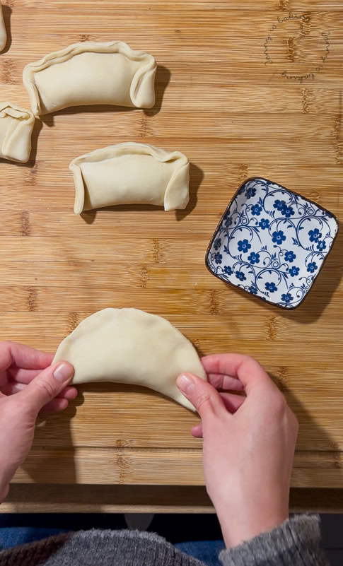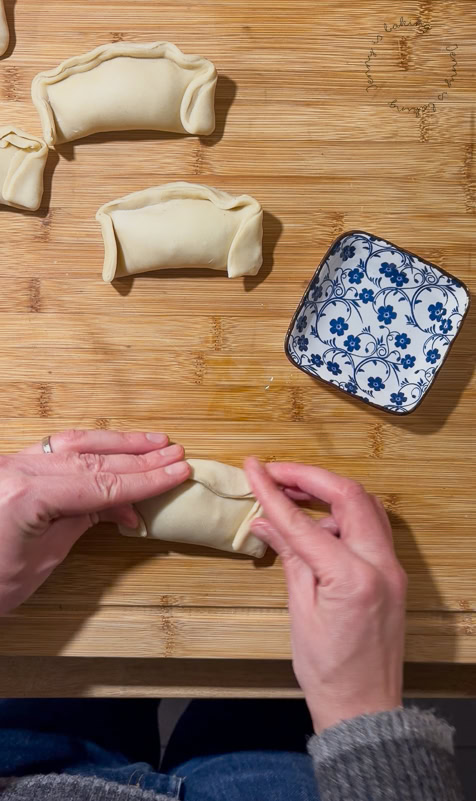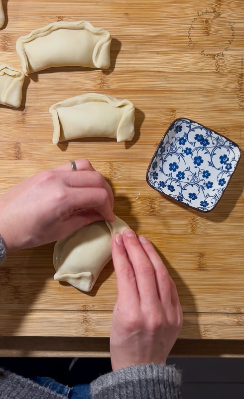 Chilenische Empanadas bekommen keinen geflochtenen Rand, sondern der Halbmond wird an den Seiten und oben zur Mitte umgeklappt