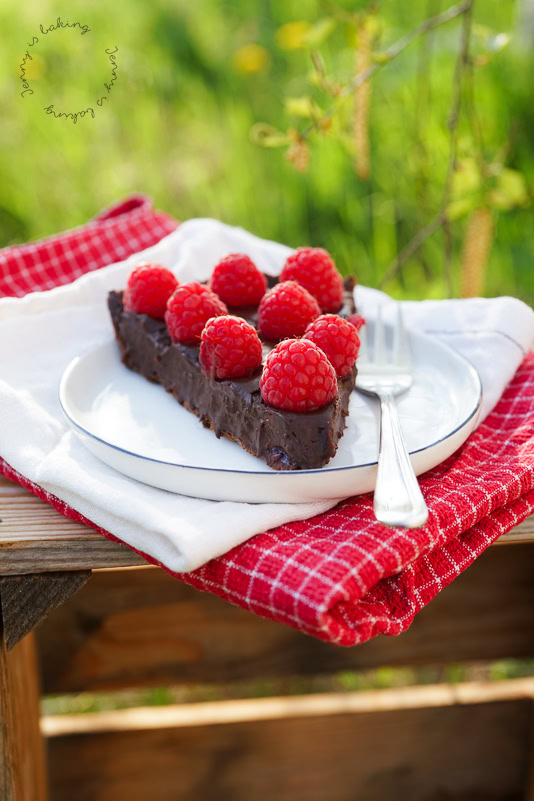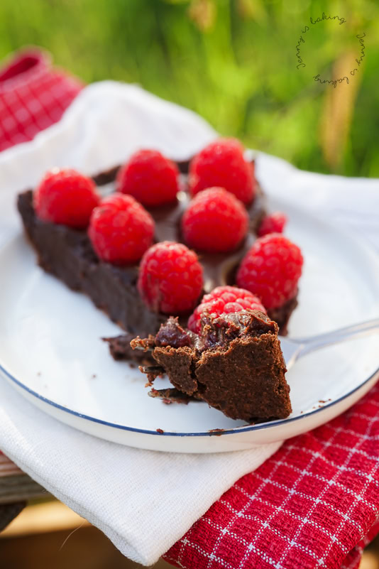 Psst, ich habe in diesem Fall sogar die Himbeermarmelade selbst gemacht. Ich mache öfter im Jahr welche mit gefrorenen Himbeeren. Am liebsten mit Gelierzucker 2:1, dann ist sie wunderbar säuerlich. Bei dieser Schokobombe finde ich es zwingend wichtig, dass man eine Schicht Himbeermarmelade hat, ein säuerlicher Kontrast zu der ganzen Schokolade bzw. Ganache, sonst wird der Geschmack zu einseitig. Perfekt an dieser Tarte ist ebenso, dass man sie unbedingt am Vortag zubereiten sollte, damit sie gut hart wird und sich einfach schneiden lässt.