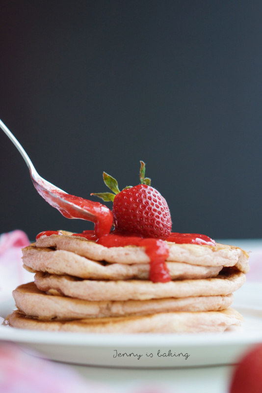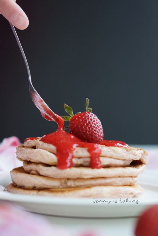 Amerikanische Erdbeer-Pancakes mit Erdbeersoße! Mein Blogevent starte ich hiermit mit der Regenbogenfarbe ROT und meiner Lieblingsmahlzeit FRÜHSTÜCK! Im Nachhinein frage ich mich, warum ich dieses Rezept nicht schon viel eher hier vorgestellt habe, so oft wie ich es bereits am Wochenende gemacht habe. Diese amerikanischen Pancakes sind wunderbar leicht, fluffig und luftig mit einem ganz starken Erdbeergeschmack. Denn wenn schon, denn schon, Erdbeeren gibt es sowohl im Teig als auch in der Soße. Die Soße besteht aus pürierten Erdbeeren, die mit etwas Zitrone und Zucker verfeinert wurden.